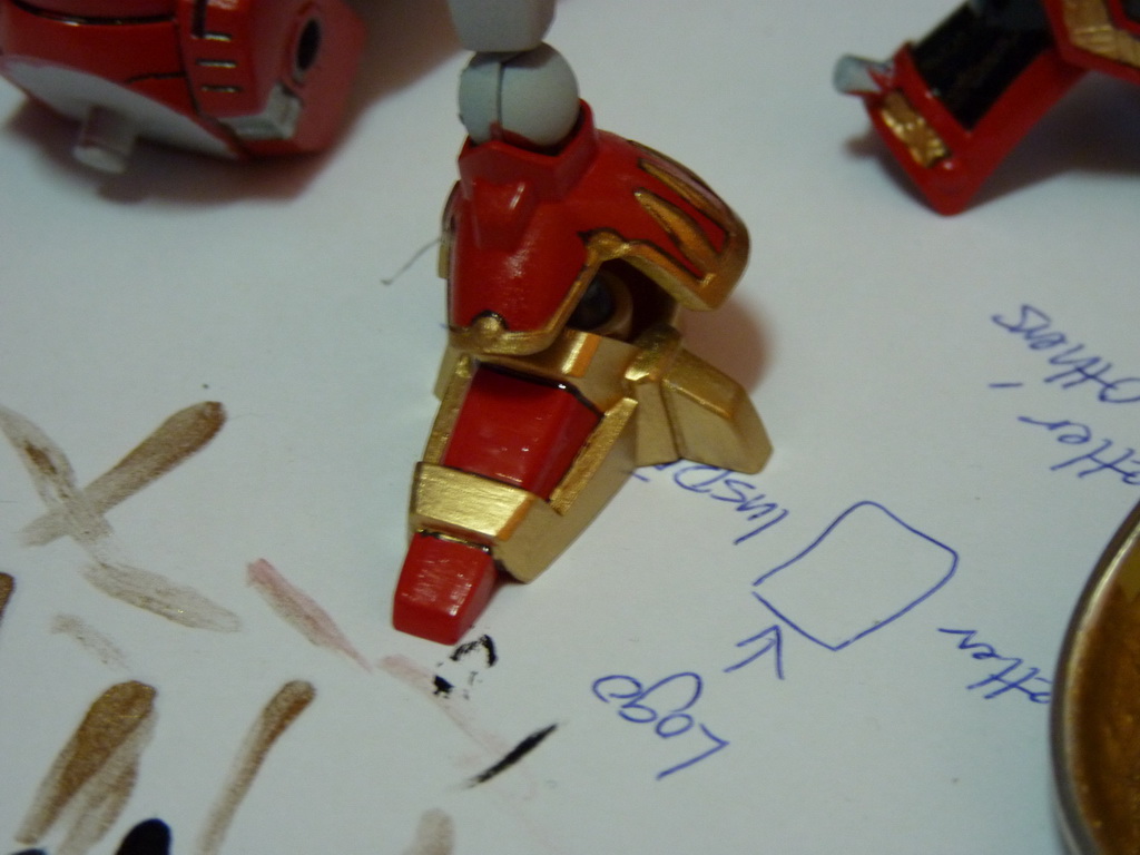 The bold head(not shown), helmet, body, left leg / foot & shoulder are painted with gold color. Looks much better now. Also, painted Super Black on the shoulder.